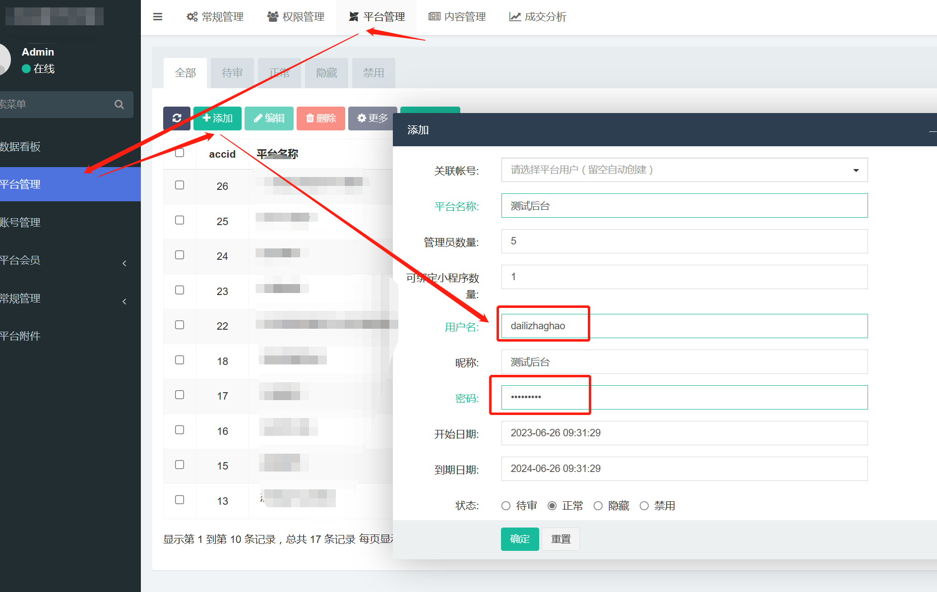 在超管后台的【平台管理】里面创建代理后台的时候就会要求输入账号密码,这个账号密码就是代理后台的总管理员账号密码。