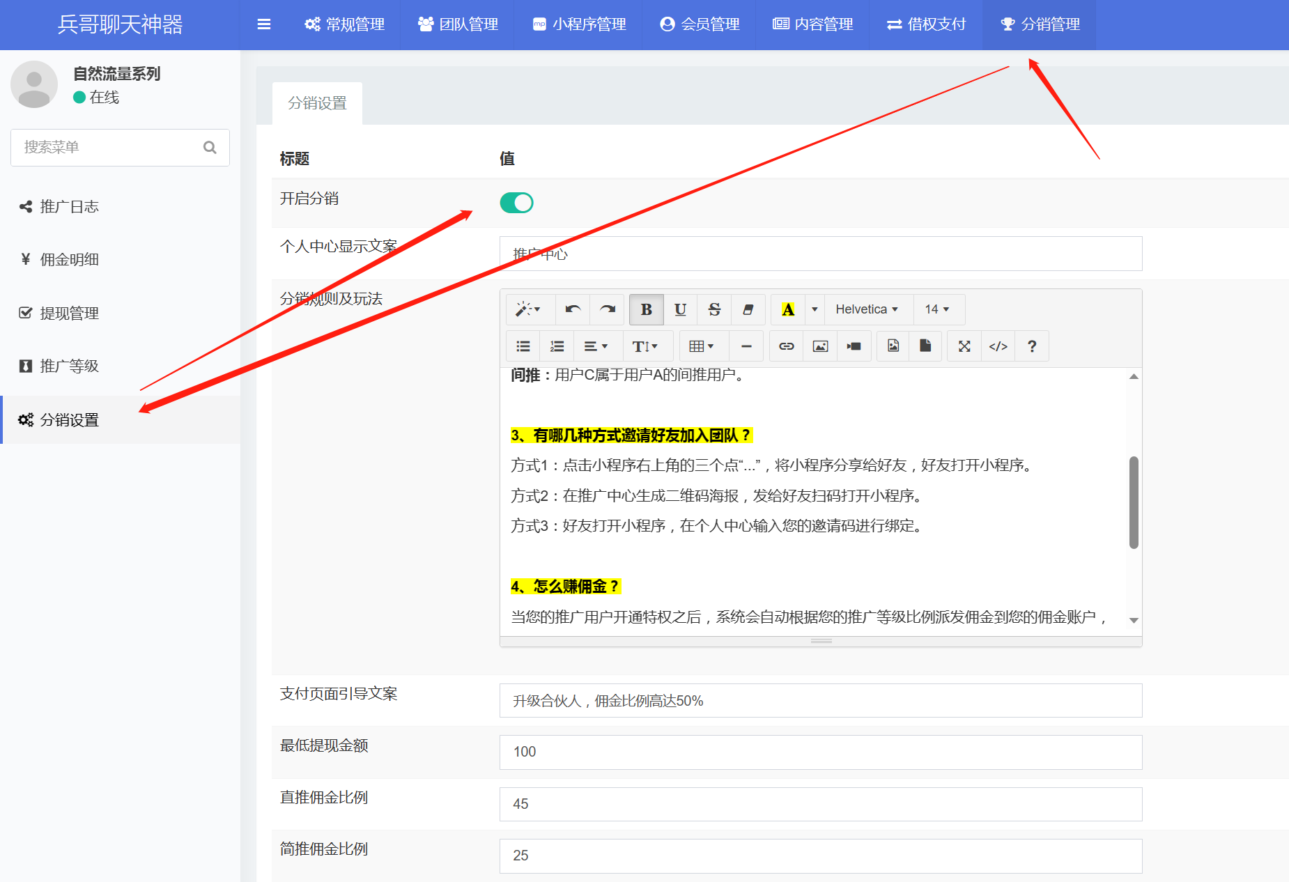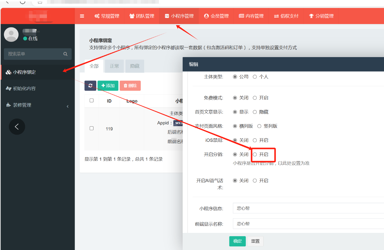 2. 小程序是在矩阵里面单独开启分销(小程序必须开启这个开关才有效,第1步的开关是控制H5端的)