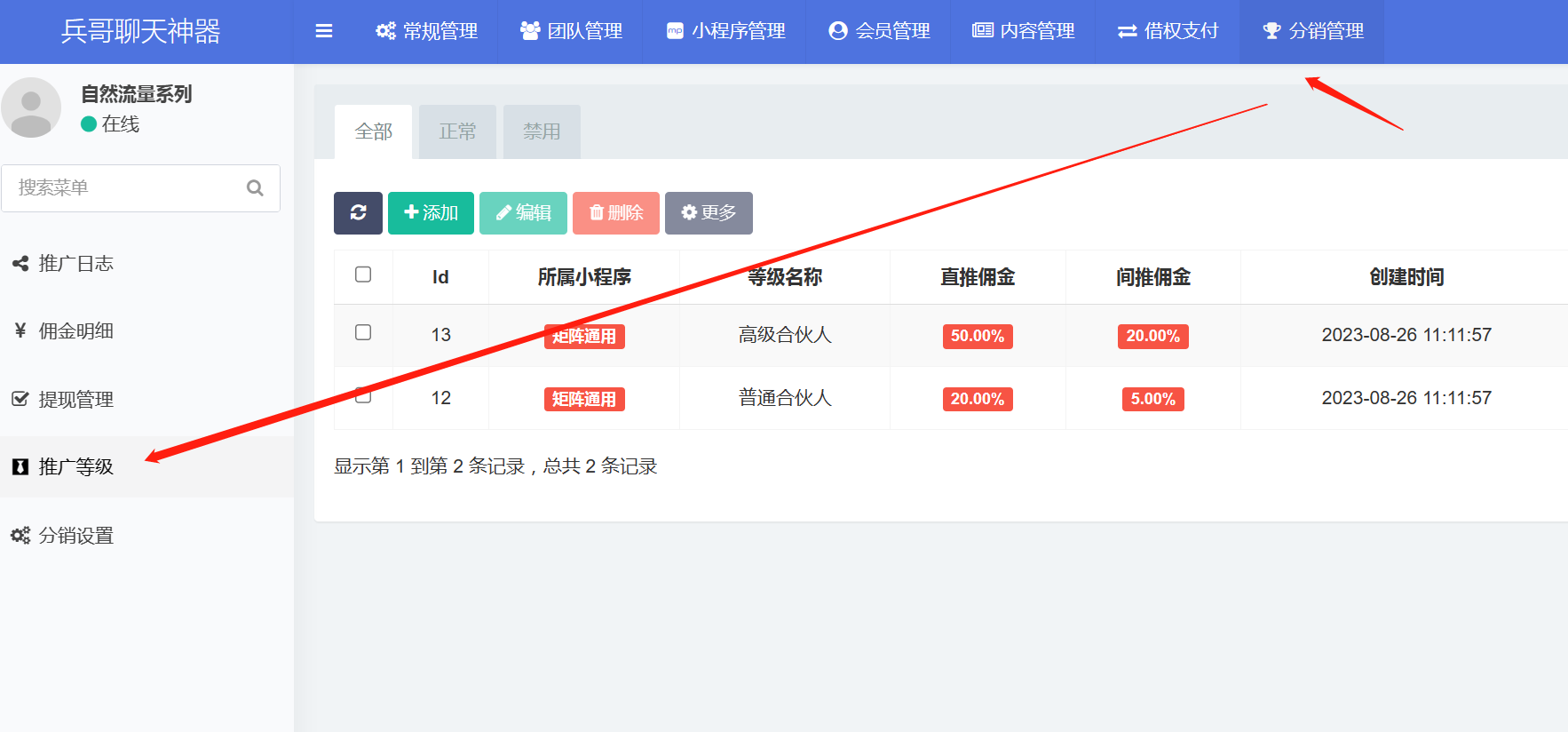 3.分销等级对应的分成比例,可以在【分销管理-推广等级】里面修改编辑。