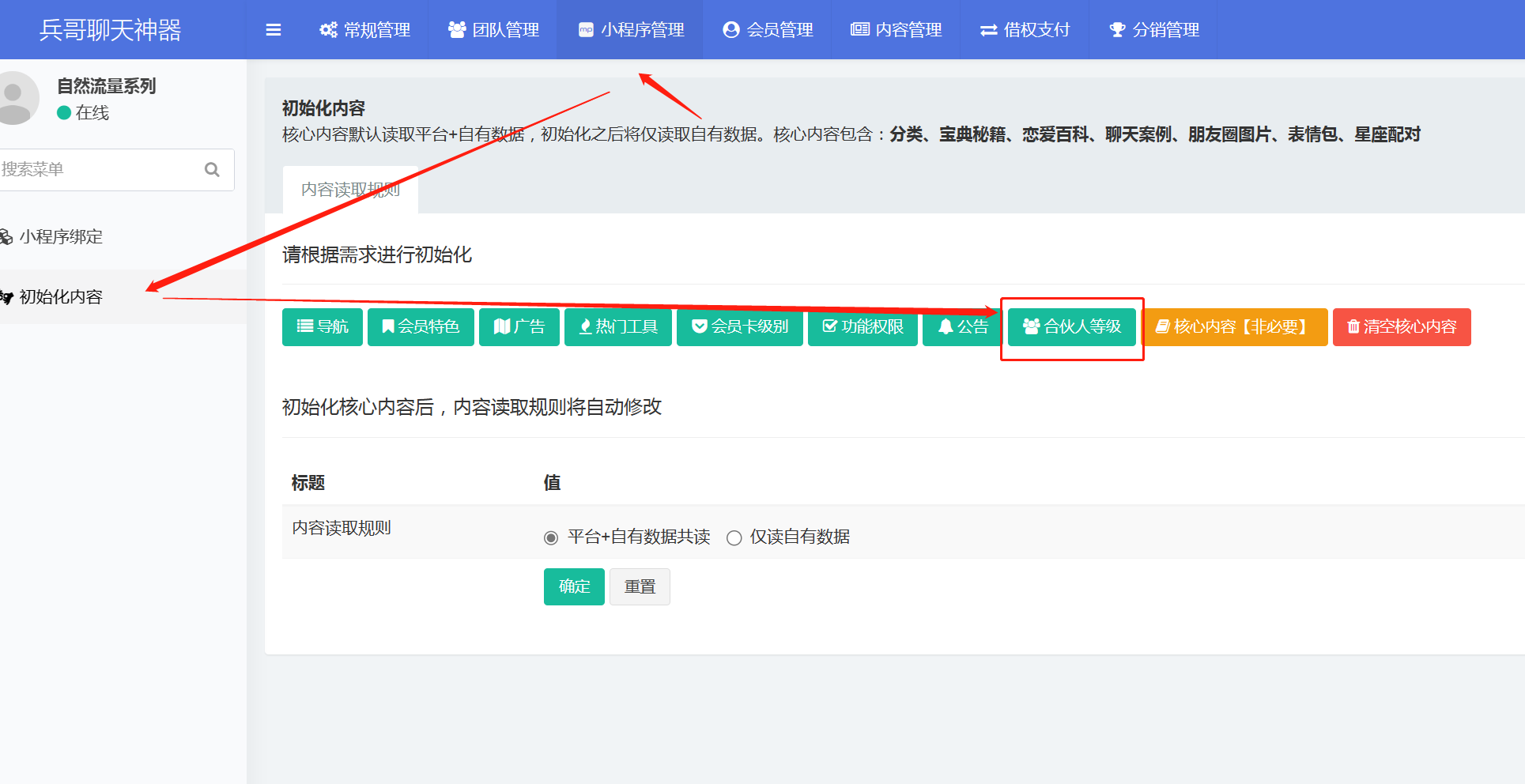 1. 进入代理后台【小程序管理-初始化内容-合伙人等级】点击初始化即可。