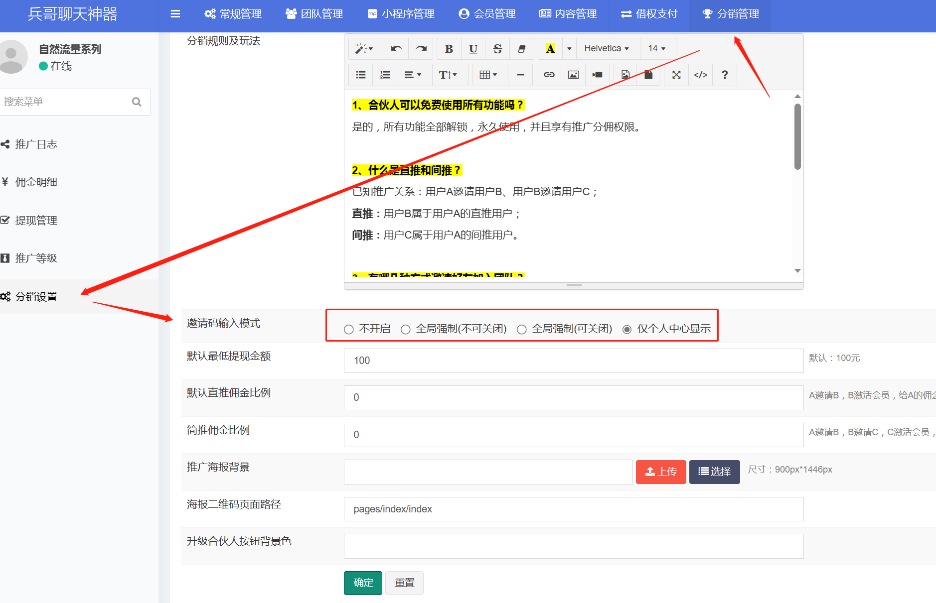 1. 强制邀请码模式:新用户必须输入上级邀请码绑定之后才能使用小程序。