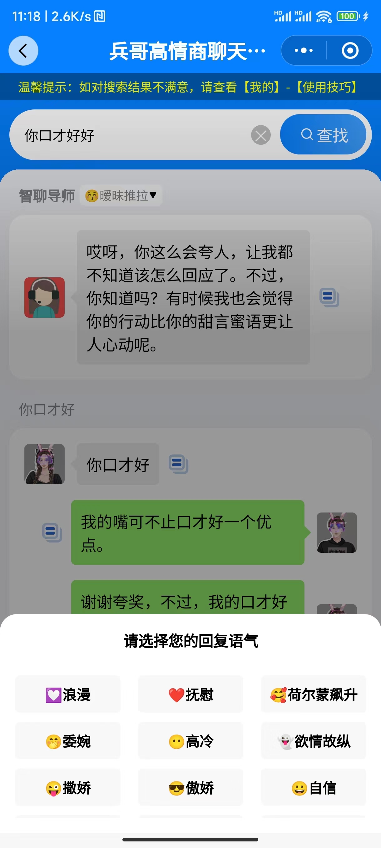 > 概念解析:在搜索话术的同时,借助AI的强大理解能力实现按语气生成高情商回复,后台可以自定义语气模型,用户在前端选择相应语气生成不同类型的回复。