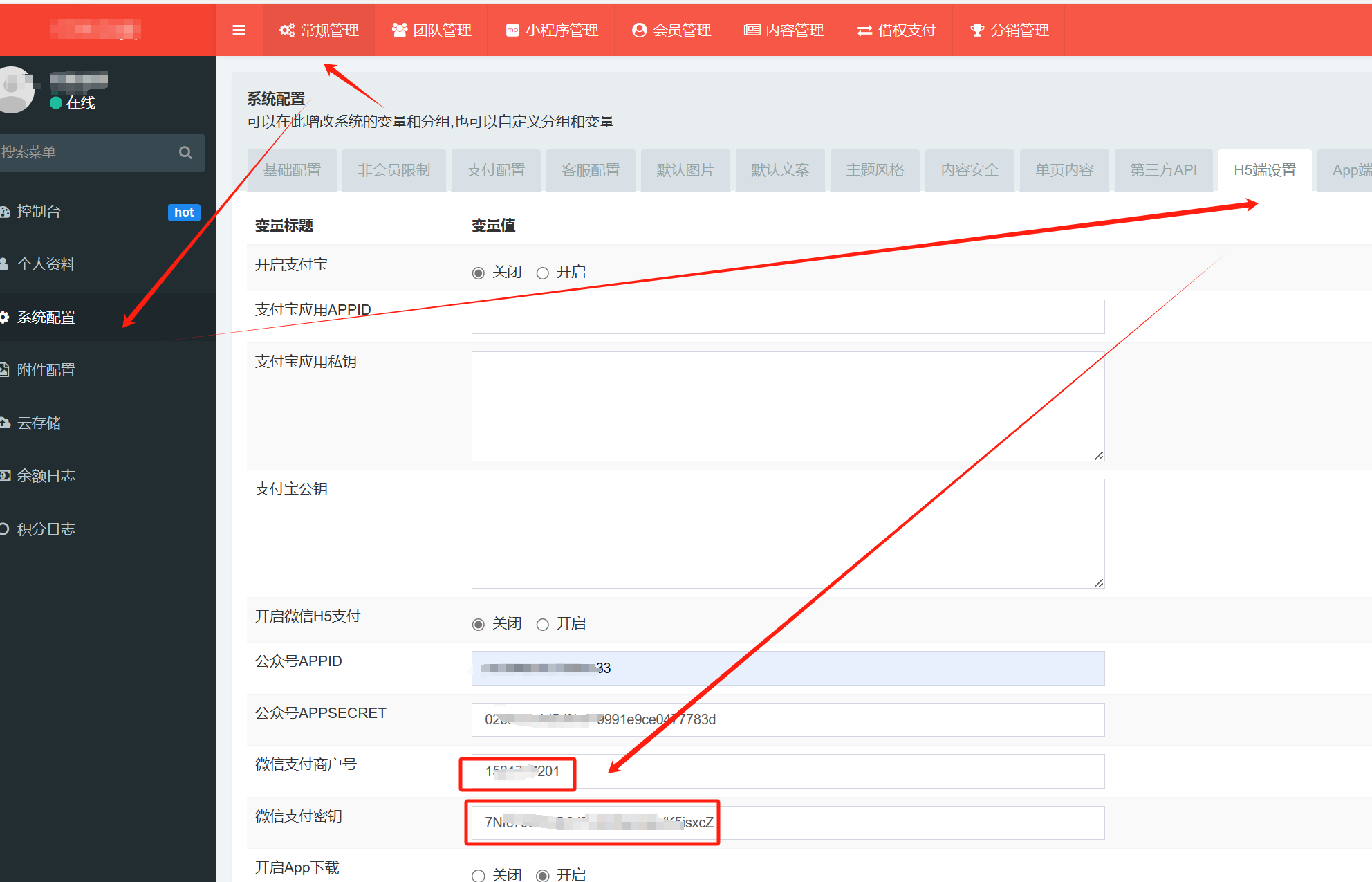 > 登录【代理后台】-【常规管理】-【系统设置】-【H5端设置】配置微信的H5支付商户号和密钥