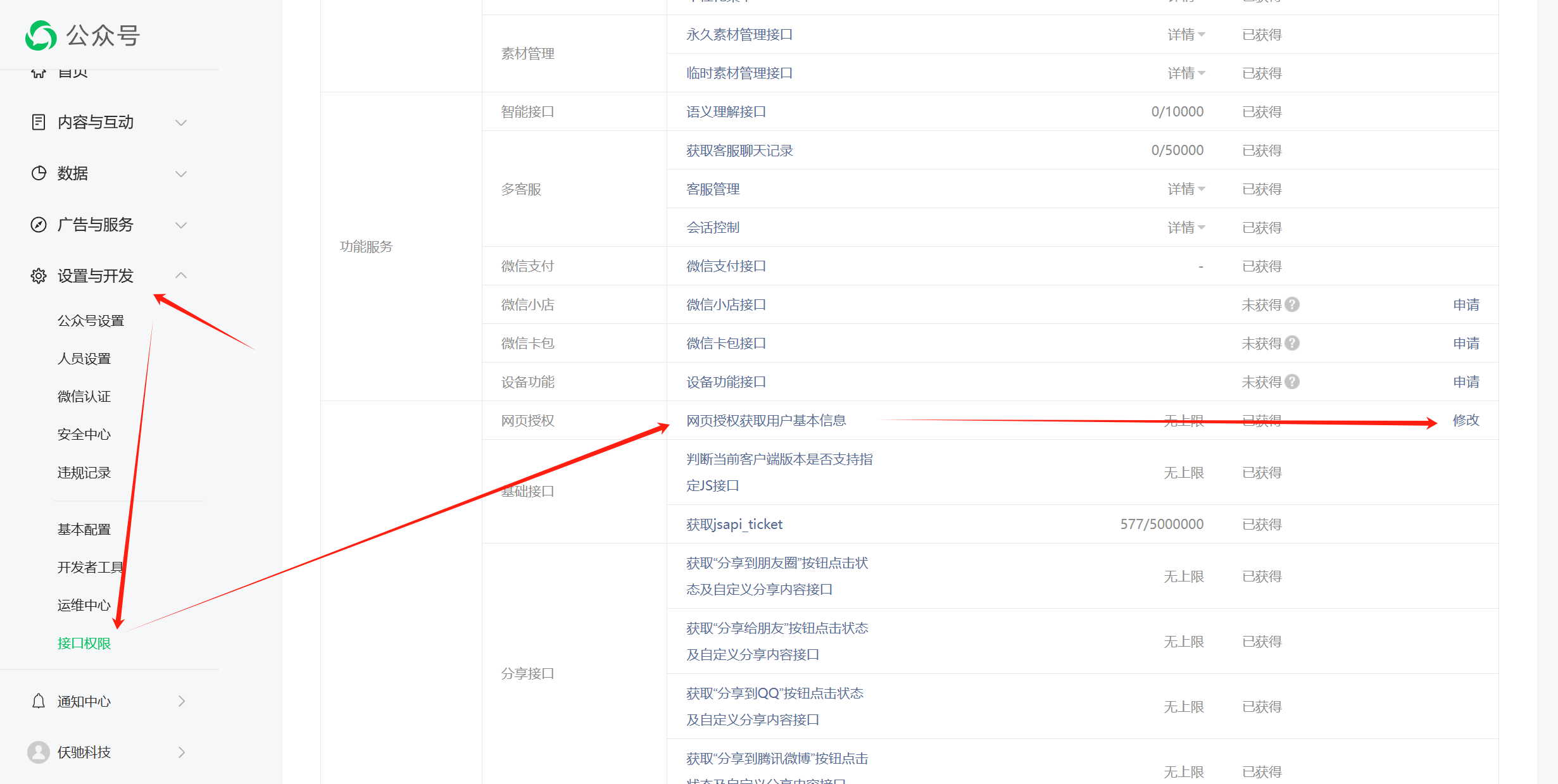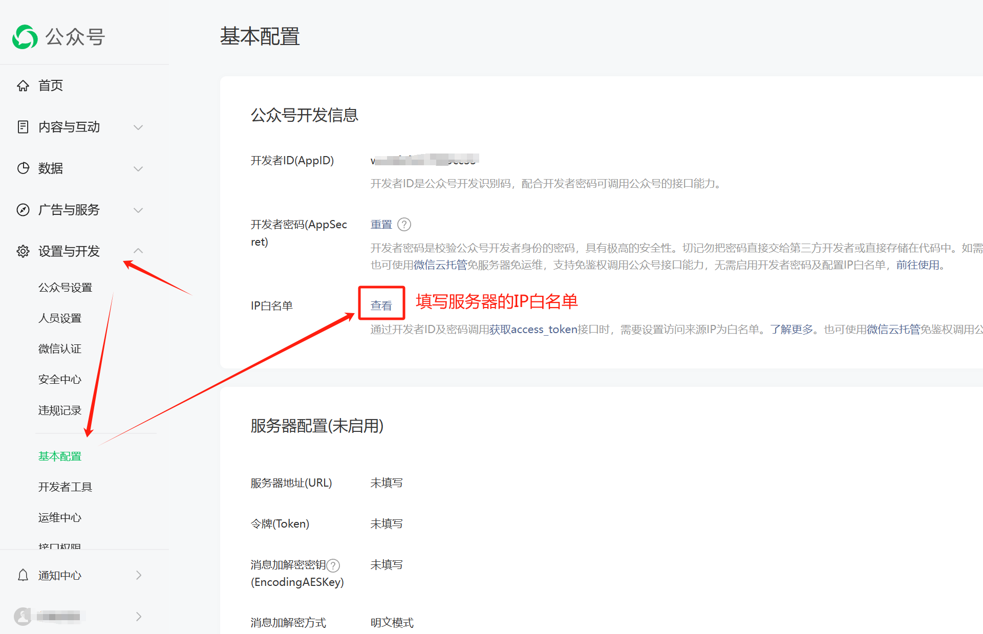 2. 登录[微信公众号后台](https://mp.weixin.qq.com)设置公众号的网页授权域名和IP白名单