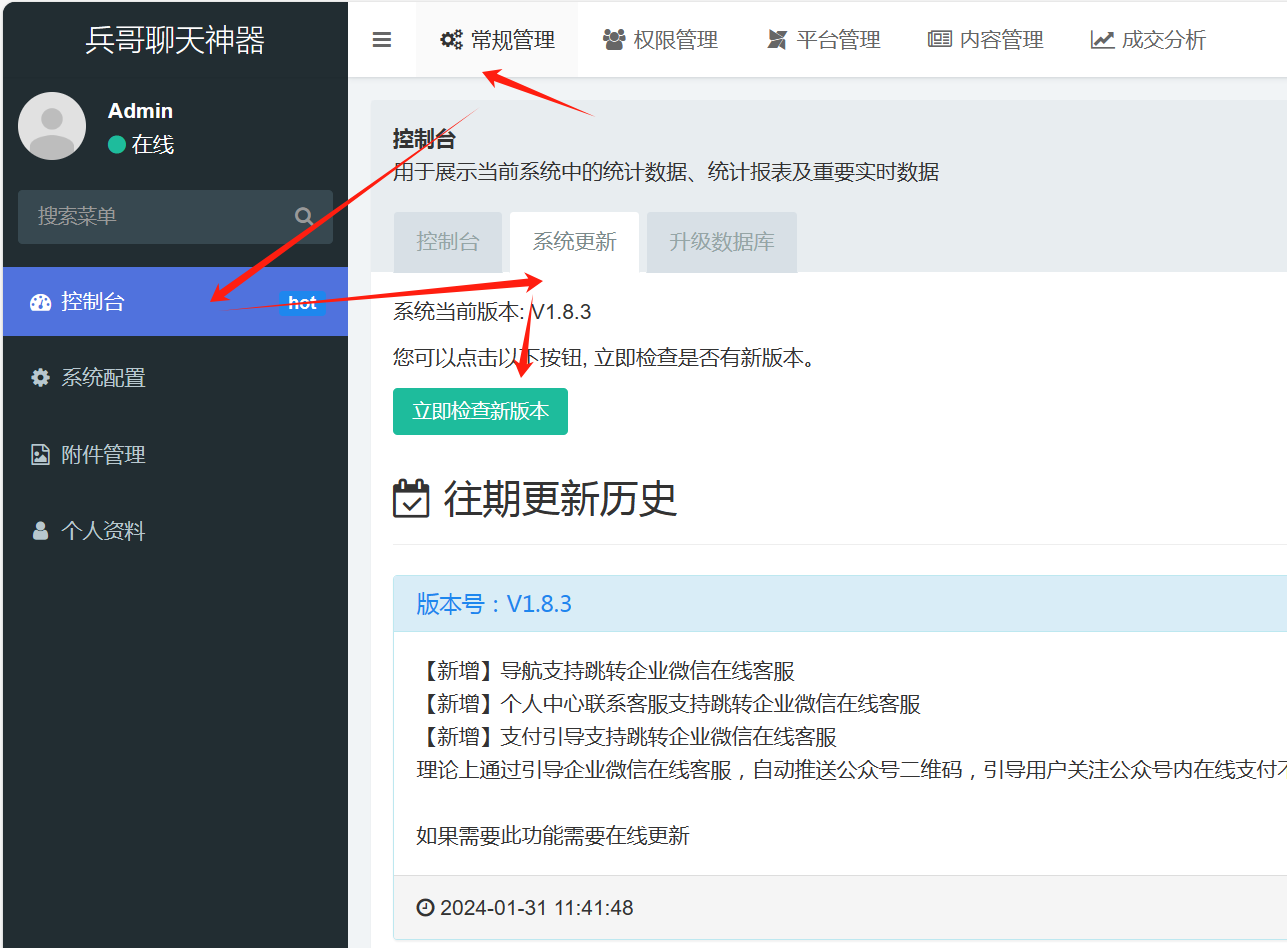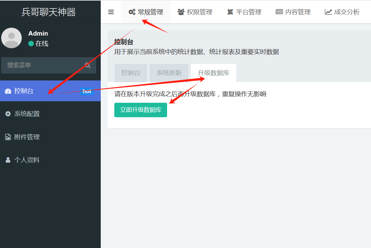 > 系统升级操作路径:【超管后台-常规管理-控制台-系统更新】,升级之后再点击右边的【升级数据库】