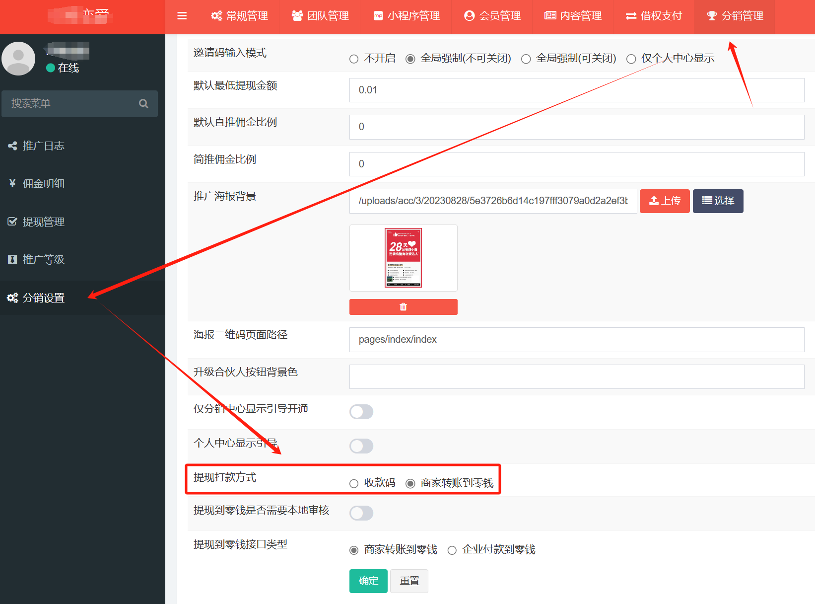 前往租户后台【分销管理-分销设置】的提现打款方式进行选择