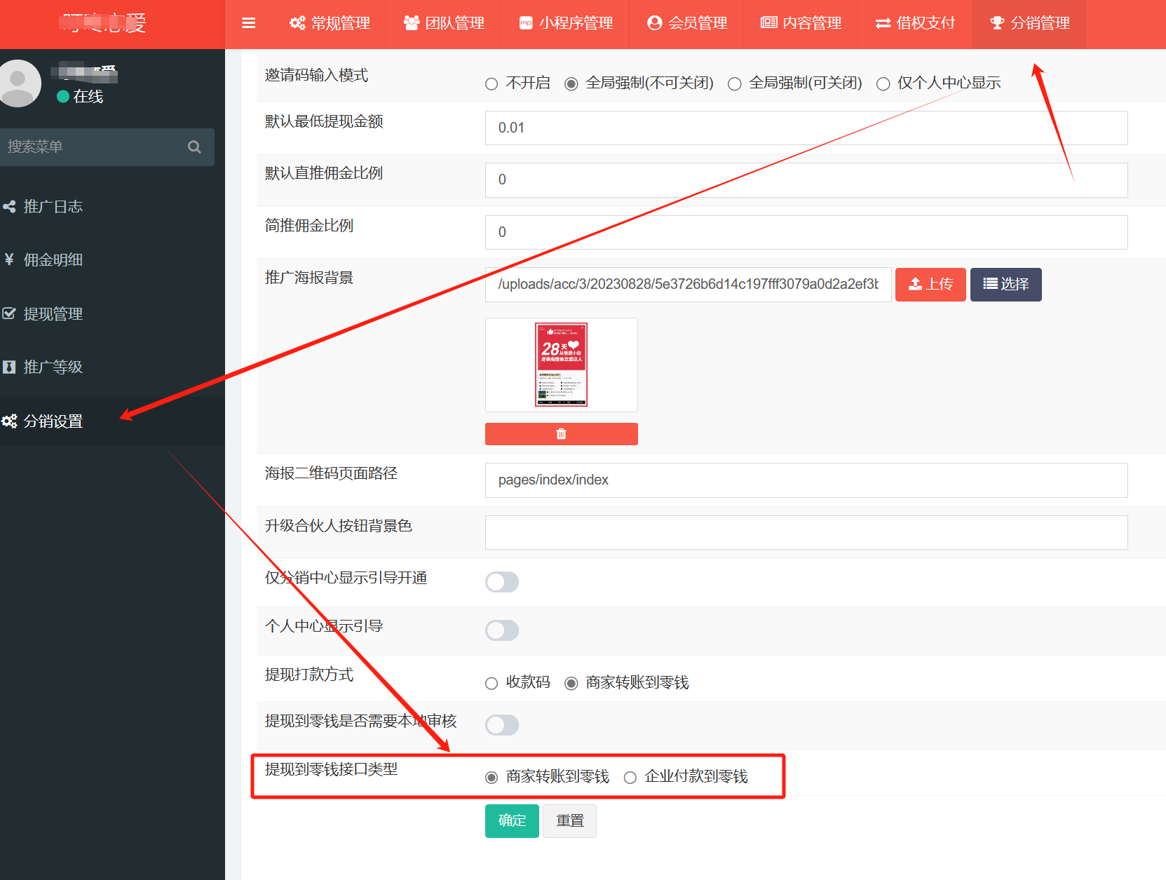 前往租户后台【分销管理-分销设置】的提现到零钱接口类型进行选择