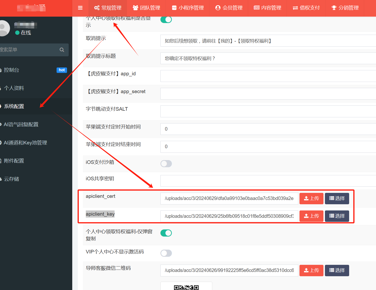 前往租户后台【常规管理-系统配置-支付配置】的apiclient_cert、apiclient_key分别上传第一步生成的证书