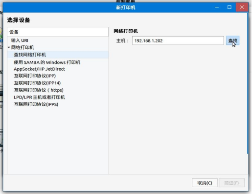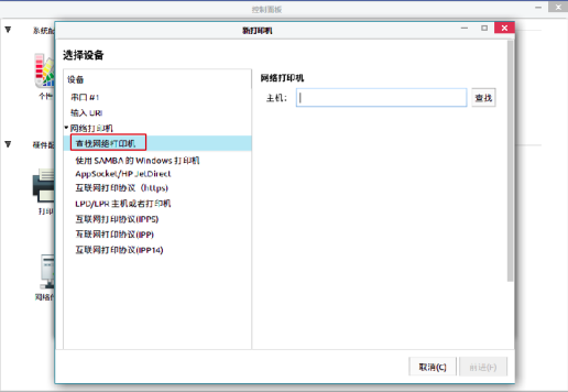 在打印机未直接识别的情况下,选择“查找网络打印机”按钮,然后在该页面右侧的输入框输入网络打印机的ip地址,输入完后点击旁边的“查找”按钮,如图2-4、图2-5。
