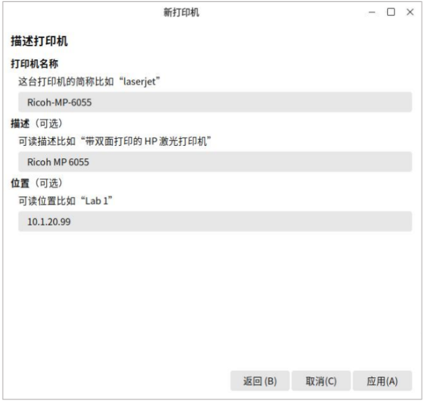 5、然后会直接弹出打印机描述界面,您可以根据您的需要更改该界面内容,也可以直接点击“应用”按钮,打印测试页,如图2-7、图2-8。