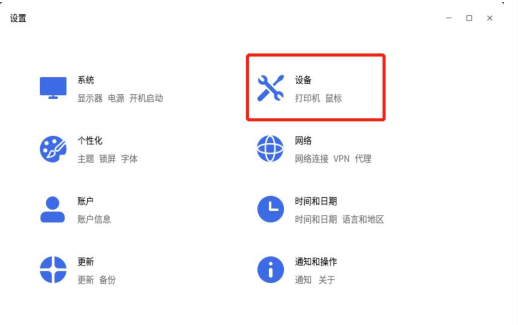 #### 首先点击开始菜单打开导航栏,找到设置,在弹出的窗口中选择设备,如图1-1所示,会自动定位至打印机模块。