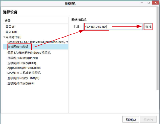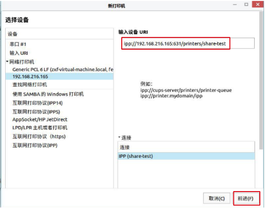 2、查找到,URI为ipp://ip地址:631/printers/打印机共享名,点击“前进”按钮,如图2-2。
