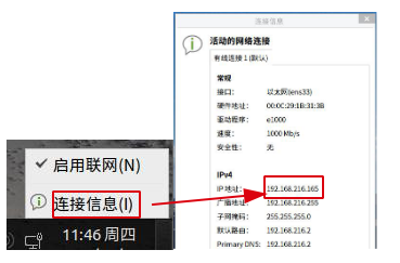 6、查看本机(服务端)的ip地址,点击桌面右下角的图标,然后右键选择“连接信息”按钮,可查看到本机的ip地址,如图1-7。