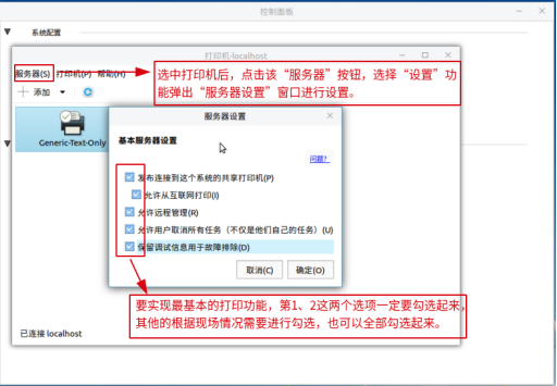 2、打开后,选中已添加好的打印机后,点击打印机上方的“服务器”按钮,选择“设置”功能弹出“服务器设置”窗口,然后进行相应的设置,如图1-2。