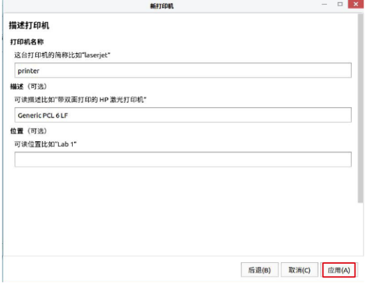 3、会直接弹出打印机描述界面,您可以自定义打印机名称,然后点击“应用”按钮,如图2-3。