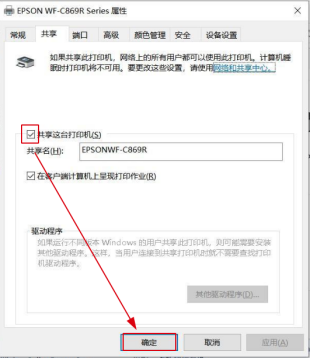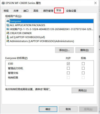 3、在打印机属性页面,点击“安全”按钮,设置共享用户的权限,设置完成后,点击“确认”按钮即可,如图1-4。