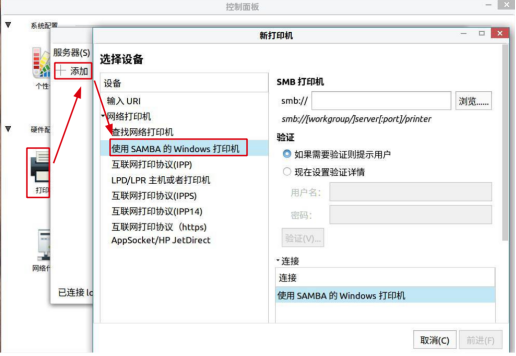 1、打开“开始菜单->控制面板->打印机”页面,点击“添加”按钮,选择网络打印机中的“使用SAMBA的Windows打印机”选项,如图2-1。