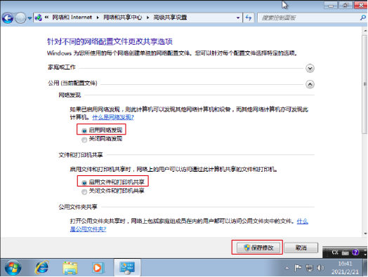 1、打开“控制面板->网络和Internet->网络和共享中心”页面,点击“更改高级共享设置”按钮,在此页面,勾选“启用网络发现”和“启用文件和打印机共享”这两个选项,然后点击“保存修改”按钮,如图1-1、图1-2。