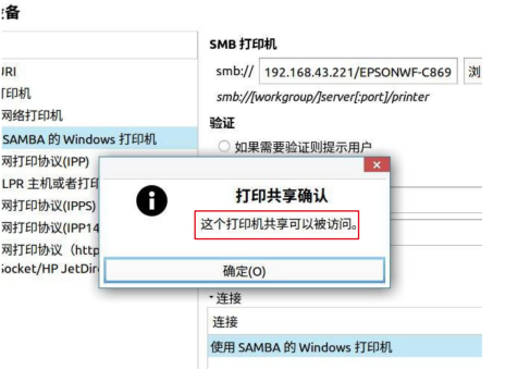4、验证后会自动弹出“打印共享确认”弹窗,或者验证后,点击“前进”按钮,会弹出“打印共享确认”弹窗,即“网络打印机连接成功”,然后添加该打印机需要的驱动即可进行打印,如图2-4。