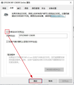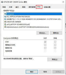 3、在打印机属性页面,点击“安全”按钮,设置共享用户的权限,设置完成后,点击“确认”按钮即可,如图1-3。