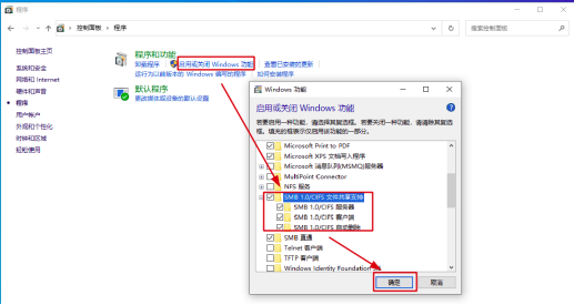 1、打开“控制面板->程序”页面,点击“启用或关闭windows功能”按钮,找到Samba服务并勾选,然后点击“确定”按钮,需要重启电脑生效,如图1-1。