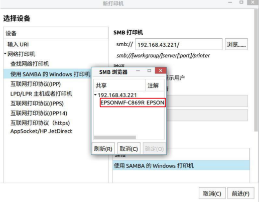1、打开“开始菜单->控制面板->打印机”页面,点击“添加”按钮,选择网络打印机中的“使用SAMBA的Windows打印机”选项,如图2-1。