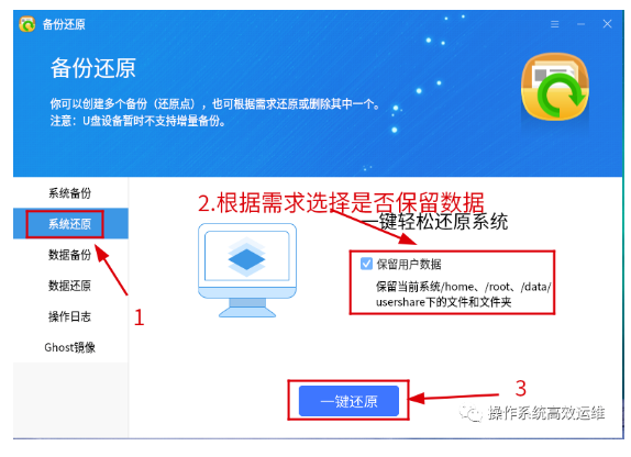 #### 2.选择“系统还原”,根据实际需求选择是是否保留数据,点击“一键还原”,如图2-2。