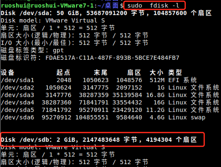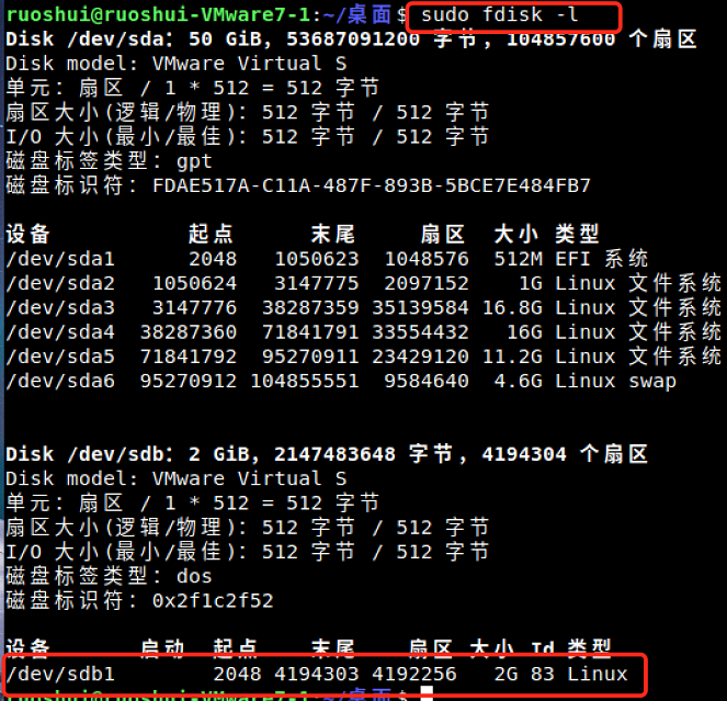 ruoshui@ruoshui-VMware7-1:~/桌面$ sudo fdisk -l