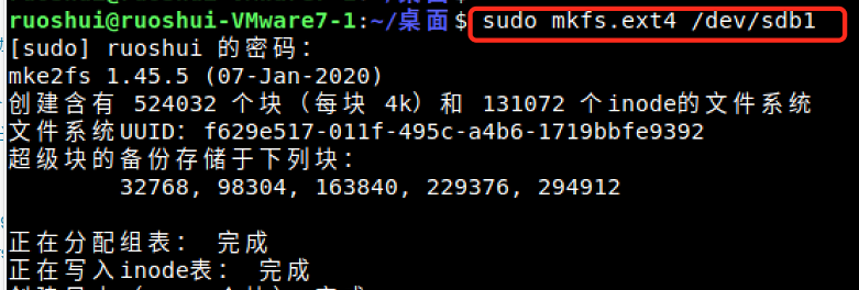 ### 4.格式化:mkfs.ext4 /dv/sdb1