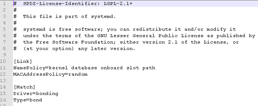 有如上四种,0是物理口的,这里不讨论。1是创建虚拟口时,若未指定mac则内核随机分配一个6Byte的MAC。2是bond口设置为从接口的MAC地址时,此时对于bond而言就是该类型。3是应用层调用了ioctl/netlink等API接口修改了接口MAC。而目前麒麟系统看cat /sys/class/net/bond0/addr\_assign\_type是3,说明有应用层修改了该MAC,后续分析是systemd-udev修改的,udev根据/etc/systemd/network,/usr/lib/systemd/network的link文件去配置mac的,