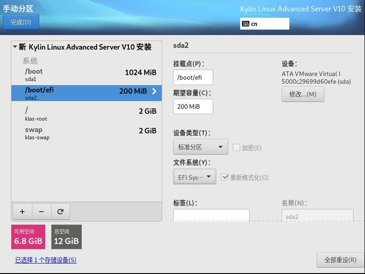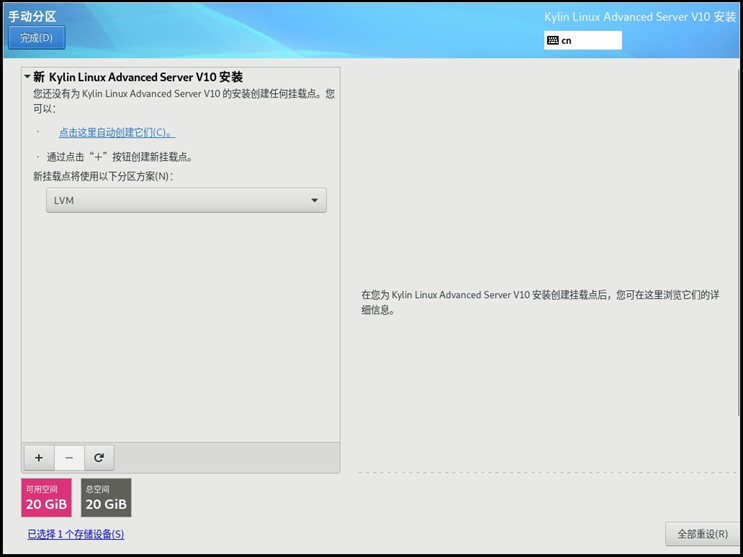 如果您将要安装的机器还有其他操作系统或数据分区需要保留,**请您千万注意提前做好数据备份**。这时您需要选择手动分区,请选择【**自定义**】,并点击【**完****成**】,进入【**手动分区**】页面,如下图所示: