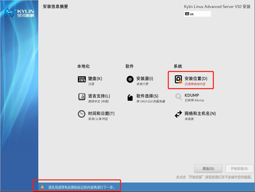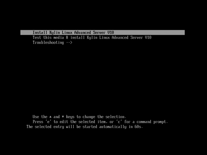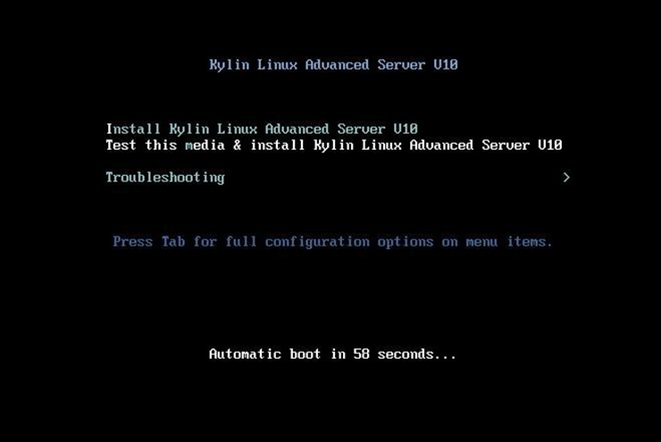 使用向上方向键选择“Install Kylin Linux Advanced Server V10”, 按进入安装过程。