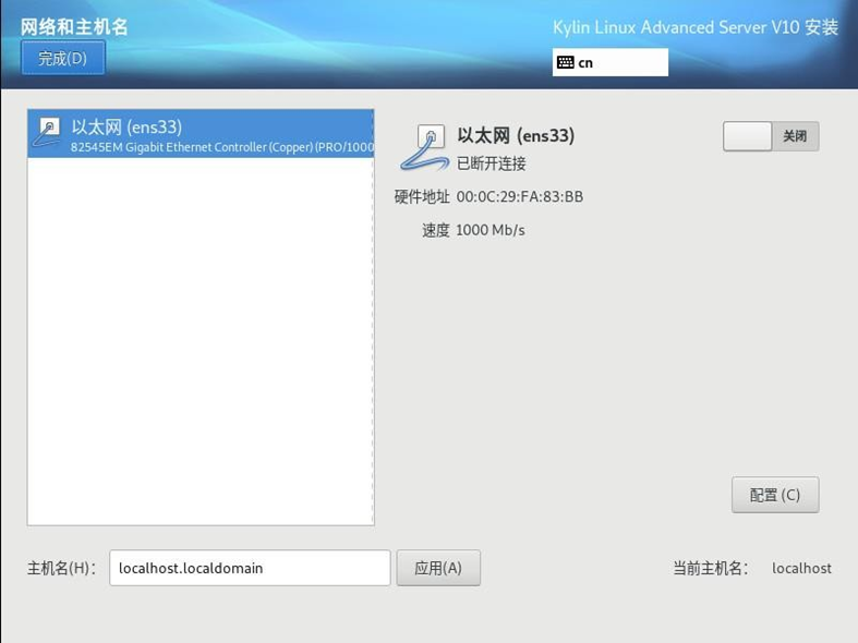 安装程序自动探测可本地访问的接口。探测到的接口列在左侧方框中。在右侧点击列表中的接口显示详情。要激活或者取消激活网络接口,请将页面右侧的开关转到【**开启**】或者**【****关闭】**。