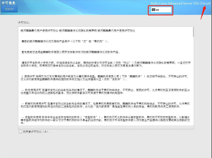 安装完成后第一次启动银河麒麟高级服务器操作系统系统,需要进行相关的初始设置。初始设置程序会提示是否接受许可协议和最终用户隐私声明;接受许可协议才可完成配置。如果在安装过程中没有创建登录系统的普通用户账户,还可以在这里创建普通用户账号。