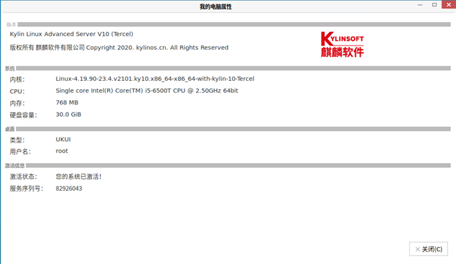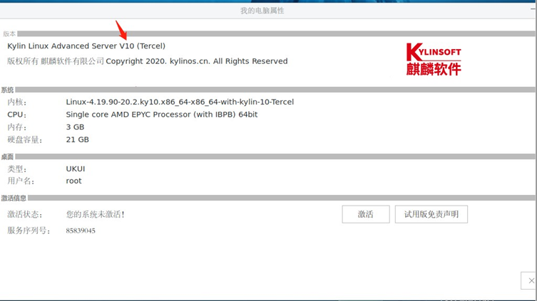 鼠标右键点击我的电脑\->属性,会显示操作系统版本信息、系统信息、桌面环境信息以及激活状态,系统未激活时激活状态显示为“您的系统还未激活,请激活”,“服务序列号”显示为 8 位的服务序列号。如下图: