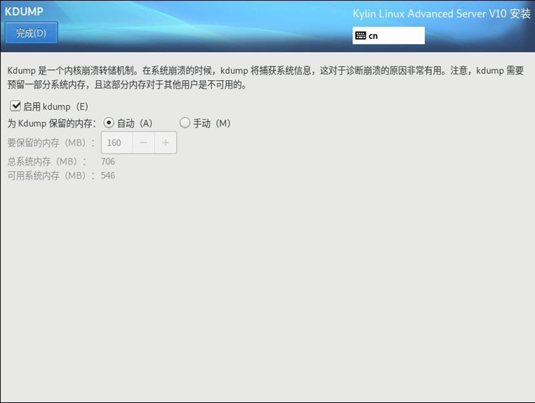 Kdump是一个内核崩溃转储机制。在系统崩溃时,kdump将捕获系统信息, 有助于诊断系统崩溃原因。注意:kdump需要预留一部分内存,并且不可以被其它用户使用。运行 free 命令也是不会显示这部分保留内存的。默认在安装中是启用kdump的。用户可以根据自己的需求进行取舍。