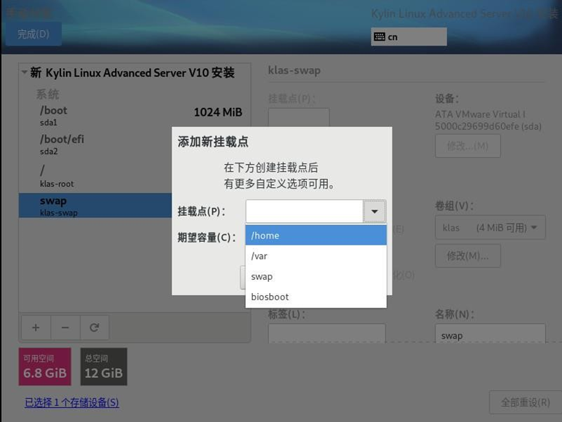 在【**手动分区**】页面中,可以使用【**点这里自动创建他们(C)****。**】进行自动分区创建,也可以手动选择合适的分区方案并手动创建挂载点,一般使用【**标准分区**】方案。点击【**+**】,会弹出【**添加新挂载点**】窗口,该窗口可完成【**挂载点(P)**】和【**期望容量(C)**】的设置,需要注意的是在ARM平台下无biosboot挂在点,如下图: