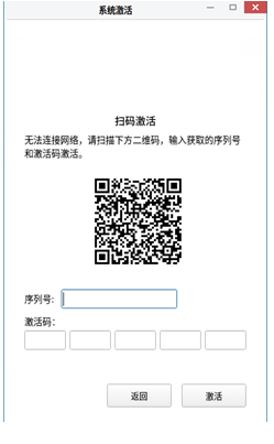激活方式选择“二维码”,在无网络的情况下出现如下窗口,输入序列号, 扫描二维码获取激活码,输入激活码后点击激活。