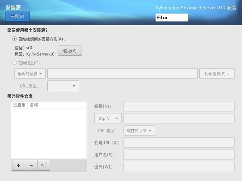 安装源用于指定银河麒麟服务器操作系统安装介质的位置。使用DVD进行光盘安装时会自动识别安装介质,通常您不需要改动。除了光盘安装,您还可以选择ISO文件、网络或USB盘安装,并且可以配置额外软件仓库。如下图所示: