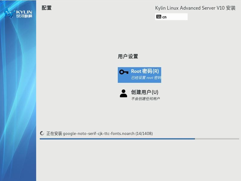 在安装过程中,必须设置【**ROOT****密码**】,可以选择是否【**创建用户**】,系统安装完毕并完成配置后,会提示【**重启(R)**】系统。