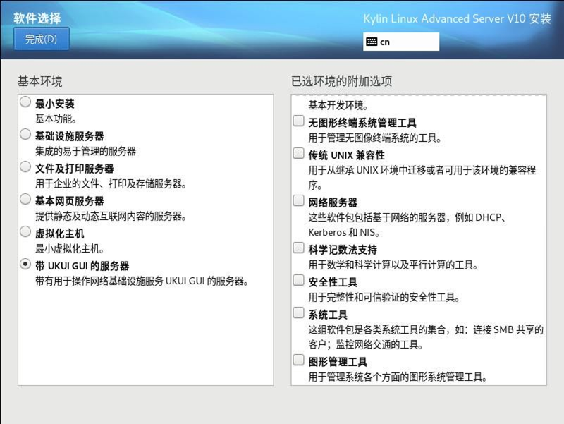 根据不同业务系统运行的服务器操作系统环境需求,安装程序默认提供了几种【**基本环境**】安装选择,安装程序默认选项是**【带UKUI** **GUI** **的服务器】**。【**基****本环境**】安装选择包括(在每个选项的右侧窗口,可选择需要安装的组件):