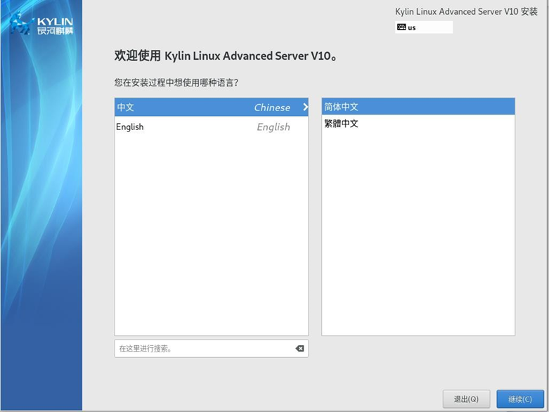 安装过程首先进入欢迎页面【**欢迎使用 Kylin Linux Advanced Server V1 0**】,如下图:
