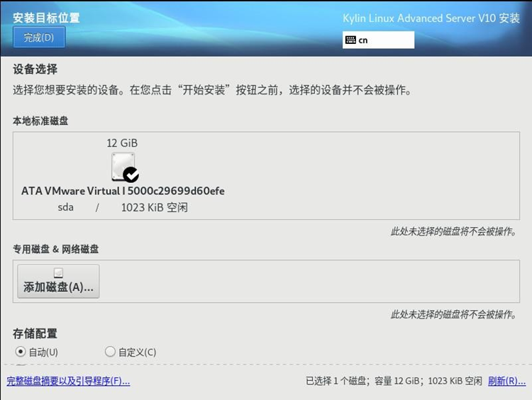 本页面用于配置安装磁盘及分区,如果您使用的是全新的磁盘并且希望使用全部磁盘空间,可以使用默认的自动分区配置,直接点击【**完成**】返回【**安装信****息摘要**】页面即可,如下图: