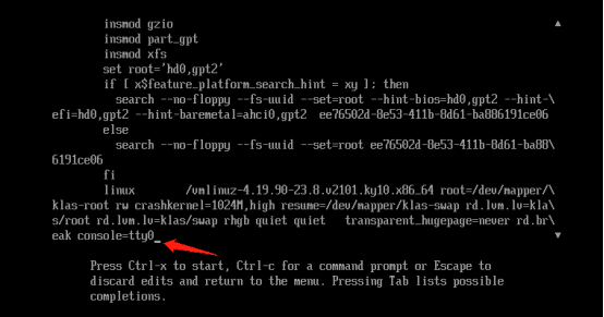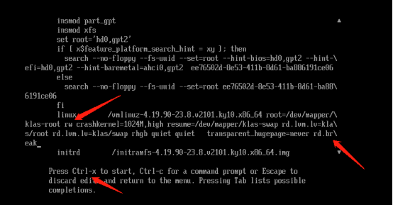 修改ro为rw,末尾添加rd.break,按Ctrl-x或F10保存继续。