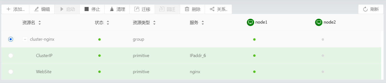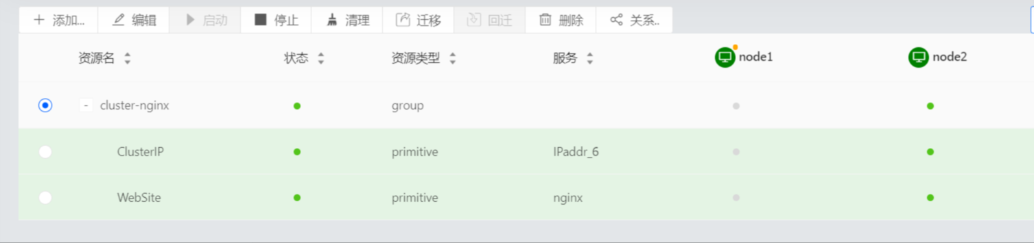 [root@node1 ~]# pcs resource group add cluster-nginx ClusterIP WebSite