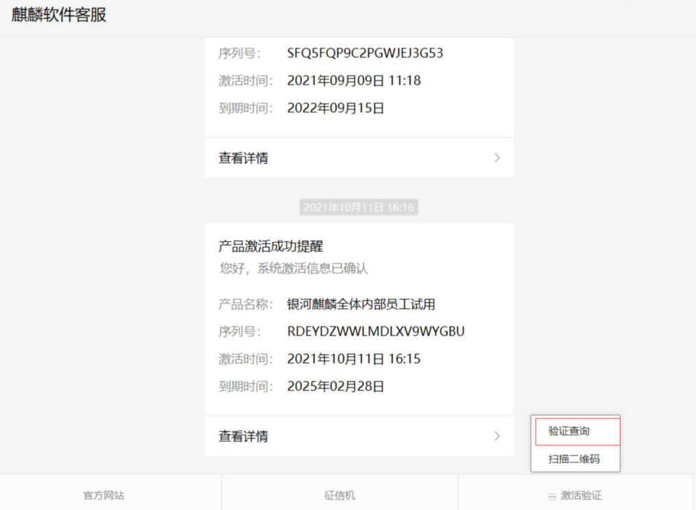 1.使用微信打开麒麟软件客服,点击 查询验证