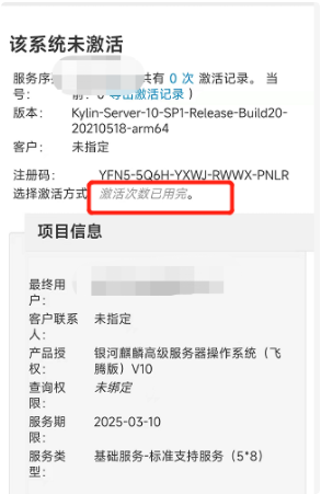 解决方法:收集服务序列号和激活信息,麒麟软件客服公众号后台取消激活,返回激活点。删除系统中/etc下的.kyhwid和.kyactivation,重新激活即可
