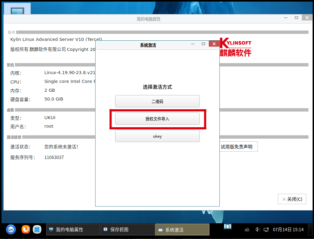 [root@localhost activation]# cp .kyinfo LICENSE /etc/ ##导入授权文件