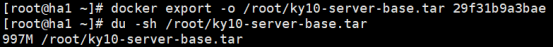 `docker export -o /root/ky10-server-base.tar 29f31b9a3bae`