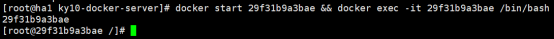 `docker start 29f31b9a3bae && docker exec -it 29f31b9a3bae /bin/bash`